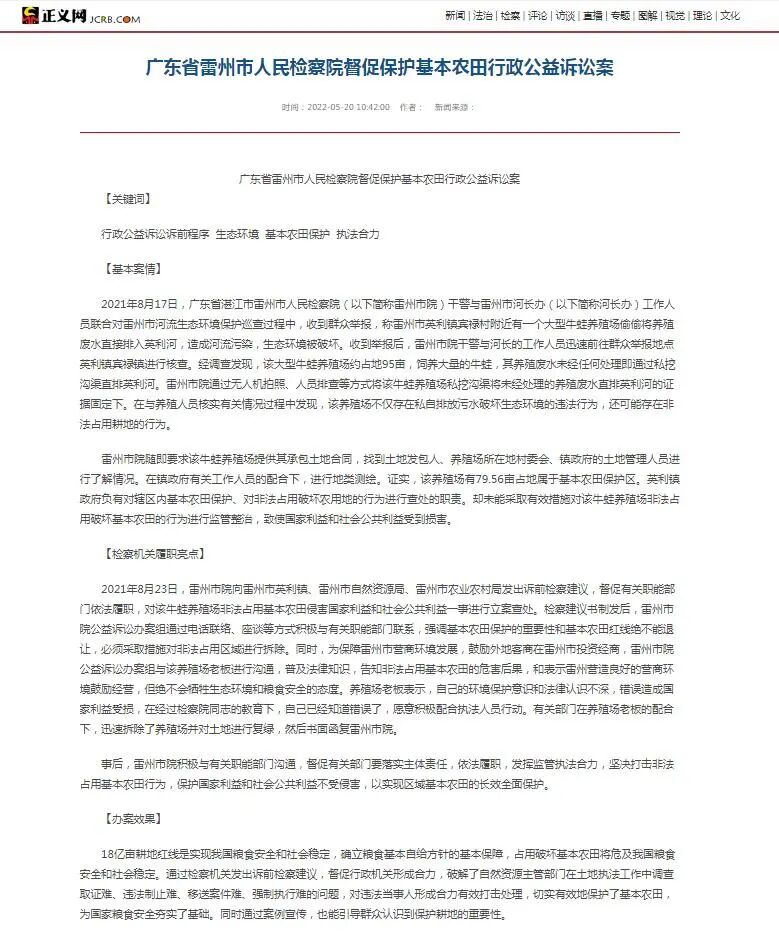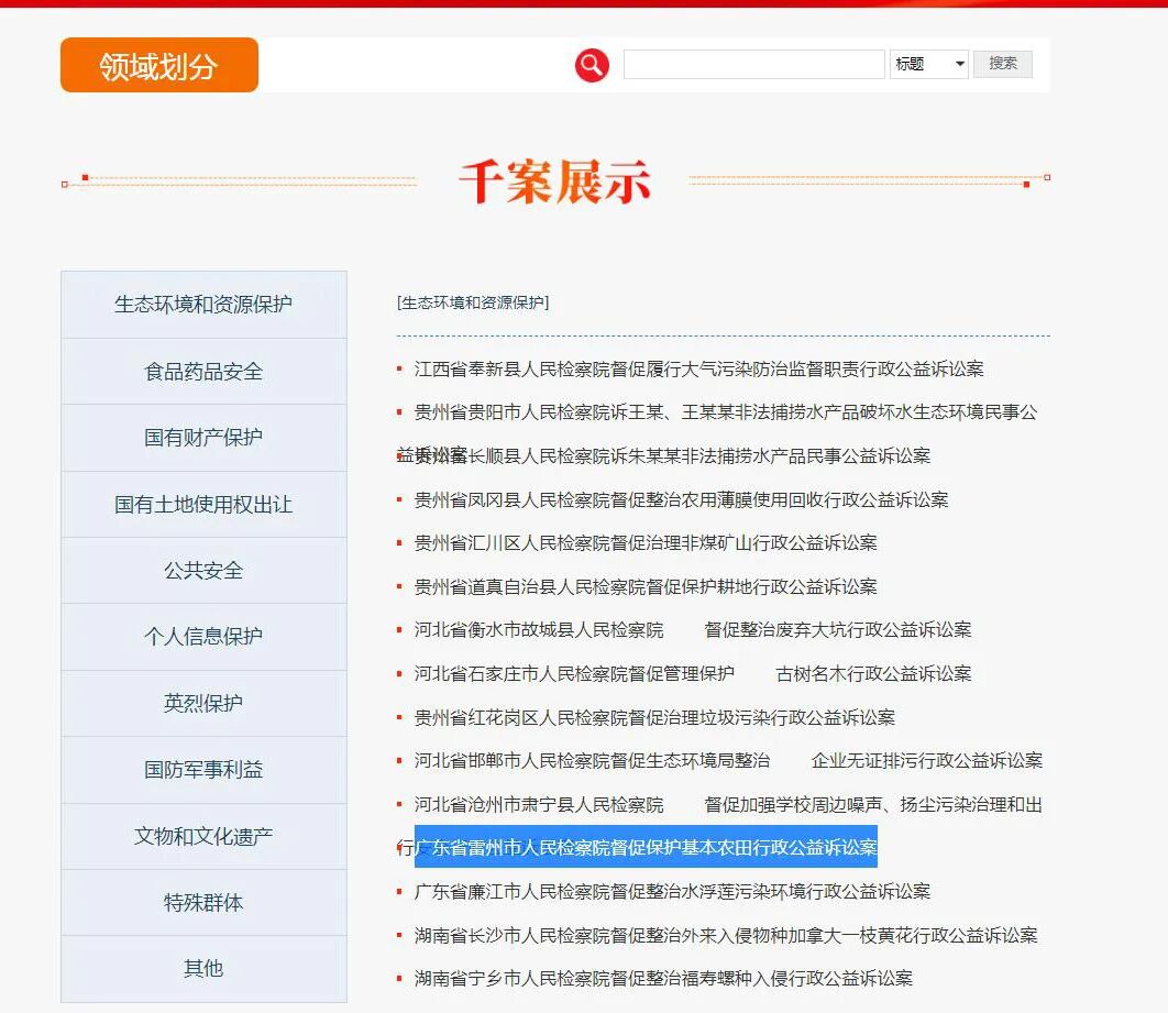 2021年8月,最高人民检察院决定在全国检察机关开展为期一年的“为民办实事 破解老大难”公益诉讼质量提升年专项活动,并同步开展“千案展示、百案评析、十案示范”活动。近日,雷州市人民检察院办理的“督促保护基本农田行政公益诉讼案”成功入选全国检察机关“千案展示”案例,并在正义网平台进行展示。