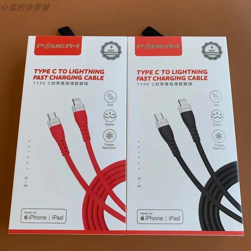 POWER4品牌原装盒装 USB-C to Lightning线,颜值还不错,长度2米,此前还开过编织线身的和1米长度的,反馈不错。目前只有黑色、红色2款,C94芯片认证线,支持苹果PD快充,不弹窗,手感柔软,线材比较粗,请注意看接口下单,谢谢。