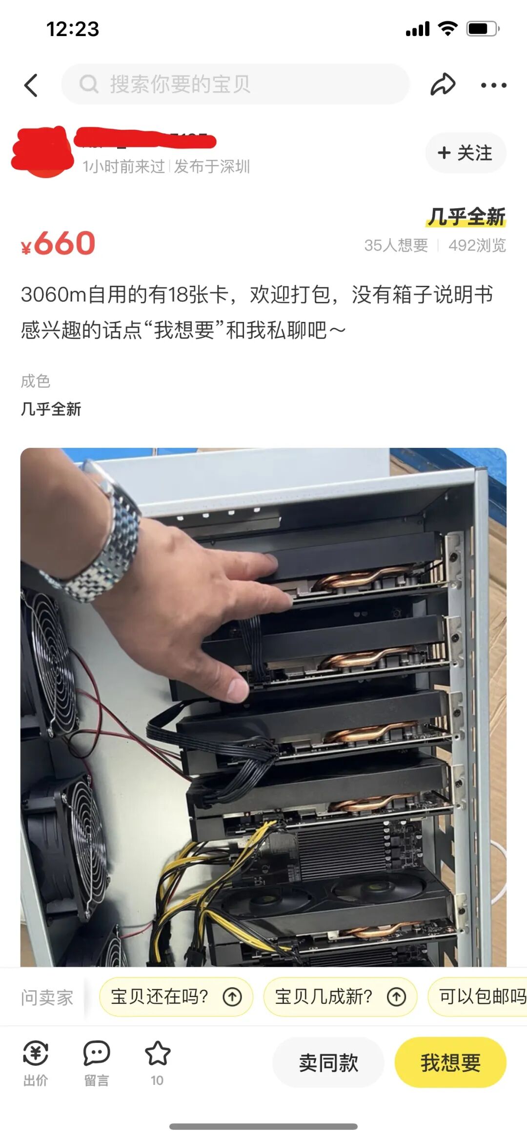 )毕竟小矿主,盘子也不大。总共就2台机器,一台上面9台3060m,我们组队买了5个,结果售罄了(后面才知道,有好多个垃圾佬群都发现了这个“宝贝”,被抢光了