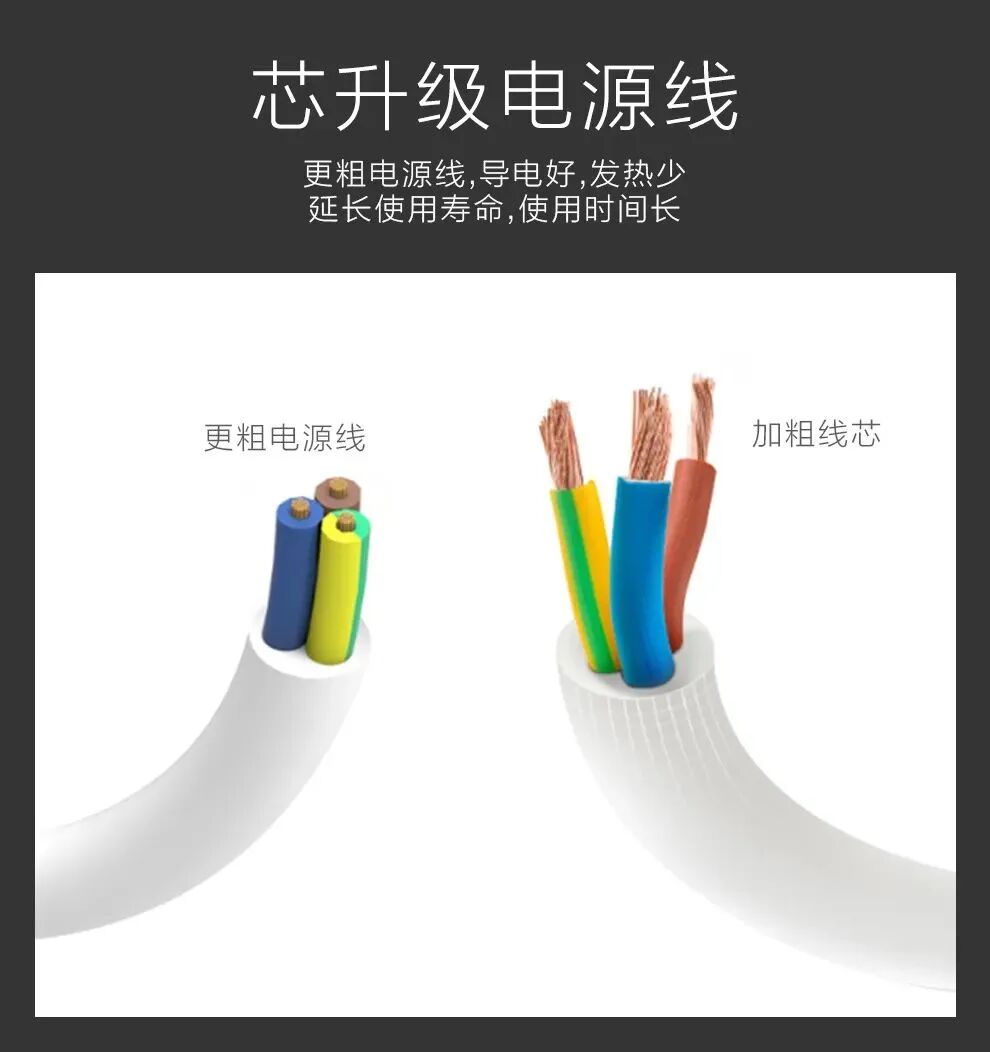 插孔内置安全的防护门,这一设计细节还能有效避免儿童手指插入或者金属物品意外插入而造成的触电危险,因此有时也被称为排插的“儿童安全保护门”。电源线全面升级,更加粗的电源线芯,提升负载能力。