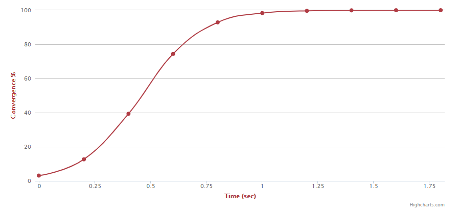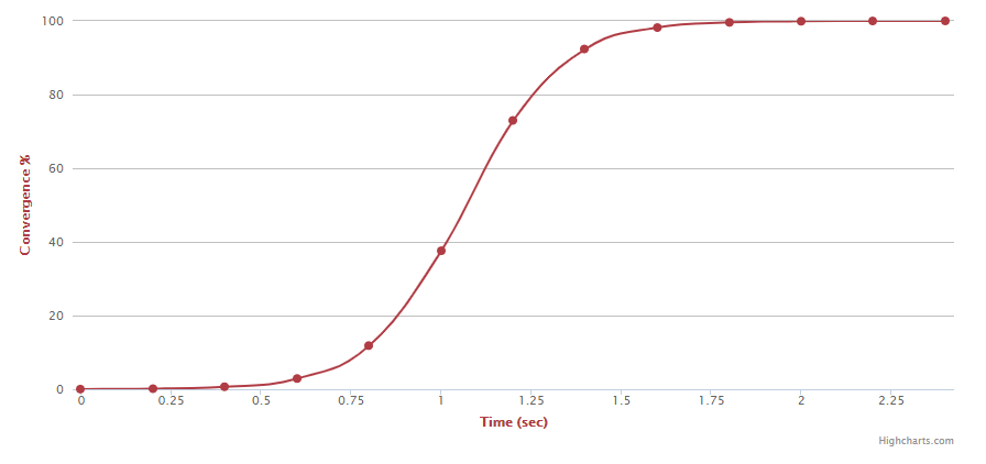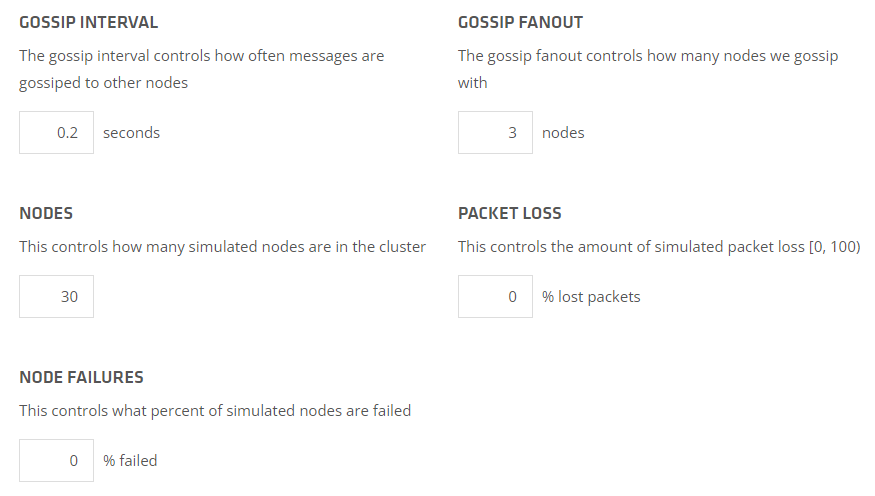 上面这个图表示的就是在信息交换频率(GOSSIP INTERVAL)为 0.2s,Fanout 节点数为 3,总节点数为 30,丢包率和节点失败率为 0 的这个情况。