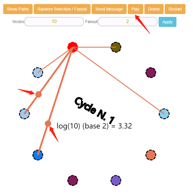 集群中有一个节点的信息更新了,这个节点知道其他 5 个节点的存在,但是它只会把信息推送给其中的两个,点击 Send Message 按钮之后就会像是这样: