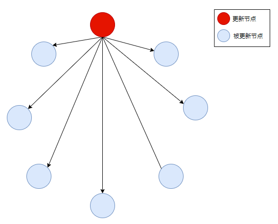 其中最上面的红色节点表示该节点有数据变更了,于是把变更的数据直接通知给剩下的节点。