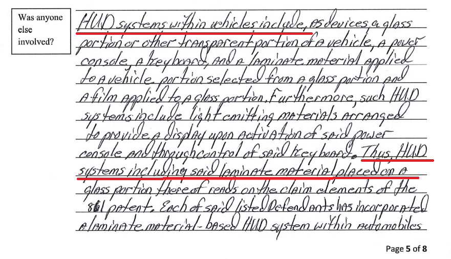 在起诉书中,亚历山大称目前汽车所用的HUD系统(抬头显示系统)都包括了他拥有专利技术的的层压式玻璃装置。