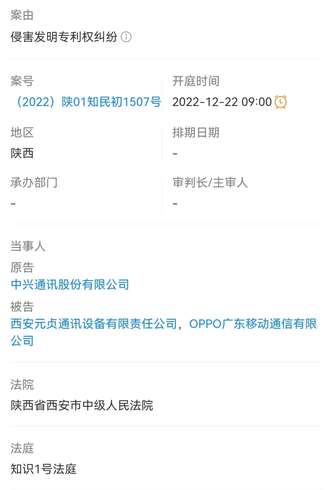11月22日,企查查系统显示,中兴通讯和OPPO公司新增一条开庭公告信息。公告显示,原告中兴通讯股份有限责任公司,与被告西安元贞通讯设备有限责任公司、OPPO广东移动通信有限公司的侵害发明专利权纠纷,将于2022年12月22日,在陕西省西安市中级人民法院开庭审理,案件编号(2022)陕01知民初1507号。
