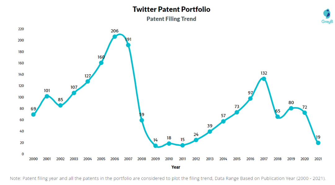 因为在马斯克收购twitter之前,twitter申请专利的目的,并非是想通过专利赢利,主要还是作为防御的工具。所以,其价值本身对马斯克就没什么吸引力。之所以会认为马斯克有可能会出售这批专利。另一个原因是在11月7日,也就是twitter将专利抵押给摩根士丹利一周后,美国一家专利咨询公司GreyB发布了一篇比较简单的针对twitter专利的分析报告。报告分析twitter专利的总体情况为:twitter在全球共有1810项专利,其中1369项已获得授权。在这1810项专利中,超过72%的专利处于活跃状态。美国是twitter申请专利数量最多的地方,其次是欧洲和英国,这似乎是合理的,因为twitter最大的市场是美国。与此同时,美国似乎是主要关注的研发中心,也是twitter的原产国。从这个数量来看,基本与“抵押”给摩根士丹利的数量相近,说明twitter确实将所有专利资产都搭上了。从twitter历年申请专利的趋势来看,每年大概在几十,最多不过200件左右,数量并不多。
