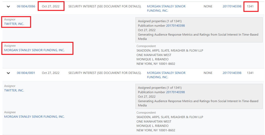 今天,马斯克通过twitter发布了其与苹果CEO蒂姆库克11月30日在苹果总部会面的消息,或许意味着双方近几天来,有关苹果应用商店是否会下架twitter的传言,已经有了一个良好的解决方案。今年4月,在收购twitter前,马斯克在提交给美国证券交易委员会(SEC)的材料中,表示已经收到了约465亿美元的融资债务承诺。根据表格附件显示,Morgan Stanley Senior Funding, Inc.和其他一些金融机构已承诺向马斯克和相关实体提供130亿美元的债务融资和125亿美元的保证金贷款。在马斯克一波三折的收购过程中,上演了报价、撤回收购、打官司、再收购等一系列的狗血剧情,最终在法院规定的最后收购交易截止日10月28日的前一天,马斯克以440亿美元完成了对twitter的收购,twitter从纽交所退市。就在收购交易完成日当天,twitter几乎所有专利资产也同步划到了Morgan Stanley Senior Funding, Inc.名下,美国专利商标局USPTO的系统中记录了这一变更。![]()