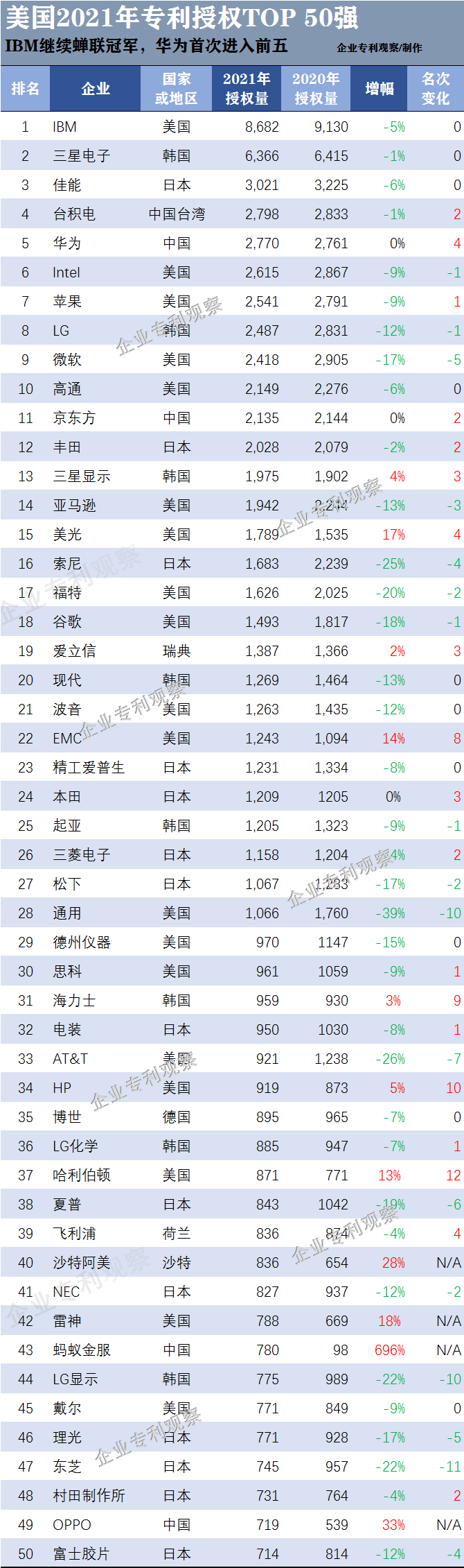 对于此类榜单,很多人最直观的体会就是:专利越多,企业创新能力越强。不能说不对,只能说这只体现了专利的一个方面。实际上创新、专利、市场的关系和各家申请专利的目的,远比这个数量更复杂。举个简单例子,在上述排行中,真正能够用专利实现正向货币化收益的恐怕只有华为一家,OPPO、vivo、小米等长时间以来申请专利,创新是一方面,更主要的目的还是为了少缴专利费,当然像OPPO的一些快充专利已经在对外许可,但是体量还不够大。格力则是善于用专利构筑行业护城河,经常起诉竞争对手,但似乎并未将货币化作为重点。腾讯本身靠的是垄断利润,申请如此之多的专利有点意外,例如一部分是偏技术的,像编解码,但是短时间难以摆脱实施人要缴费的境地。比亚迪则是专心做产品,现阶段应该还是实施人的角色,不太会拿专利去货币化。百度如果和谷歌是一个模式的话,是不会用专利去货币化的。所以,这么来看,民营企业中,大部分企业的专利,实际上并非是要用来进行许可收费的,当然不排除很多企业有这个想法,但是在实际中,往往有时收许可费的困难要远远高于交许可费的潇洒。2021年美国专利授权前50名中。如果仔细看,就会发现真正能够作为专利许可规则制定者的只有IBM、高通和飞利浦这几家老牌企业,其他的像华为、LG、爱立信、三菱、松下、夏普等现在开始收取专利费的企业,都是因为产品衰落了,不得不开始收费。也就是说,在美国的前50强中,至少有40家虽然专利数量多,但不以专利许可为企业经营的盈利点。剩余的10家中,部分进行专利许可业务的,也是因为产品业务萎缩,才开始进行的许可收费。而真正一直站在专利许可规则制定塔尖的无非就那么屈指可数的几家企业。