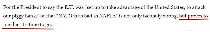 总统说,“建立欧盟就是为了利用美国,攻击我们的储蓄罐……北约和北美自由贸易协定一样糟糕”,这些言论不仅在事实上是错误的,而且还向我证明,是时候该走了。