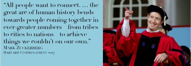 这是 Facebook 创始人马克·扎克伯格两年前在哈佛大学毕业典礼上的讲话:所有人都想彼此相连。人类的伟大历史进程中,人们总是不断聚合成更大的规模——从部落到城市,再到国家——去实现我们自己无法完成的事情。