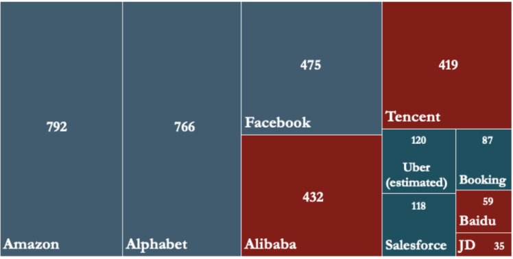 更为重要的事情发生在中国。最令人惊讶的是,中国造就了硅谷大型科技公司的竞争对手,正如你从这张市值图表中看到的,只有中国的大公司在规模上可以和美国的大公司相比。