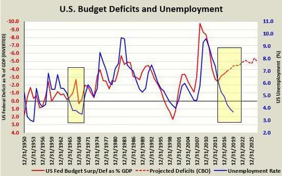 失业率如此之低而赤字还在不断增加,这种情况几乎是没有先例的。特朗普正在考验着低失业率与积极公共财政之间的关系。这种关系已经完全破裂。我们的失业率为 3.5%,但美国政府赤字已经占到 GDP 的 5% 。从历史上看,这是一个非常不寻常,而且可能十分危险的局面。历史上惟一出现过这种情况的年份只有 1968 年,当时美国将 GDP 的 10% 用于越南战争。