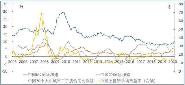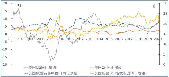 • 危机以来西方主要国家实行量化宽松的货币政策,但 CPI 一直难以达到目标且面临通缩的风险,是货币数量论失效了吗?如果我们把 M2 的增长与 CPI、房价和股市的市盈率参照来看,则会发现 CPI 与房价、股市市盈率有某种替代关系。货币过多也会反映到资产价格上。市场货币过多时,除货币流通速度延缓外,还会流向其他交易,于是出现了 CPI 与资产价格的替代现象。
