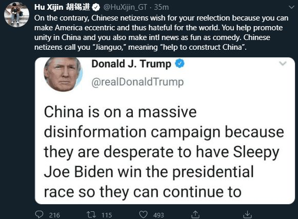 不过,这一网名之所以能流行开来,主要还是因为特朗普的对华政策。胡锡进特意在推特上用英文解释了一遍: