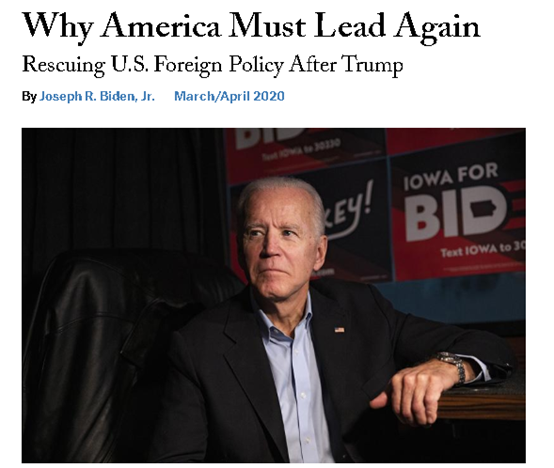 4 月份,拜登发表文章“我若当选总统,将让美国重新领导世界”指出: