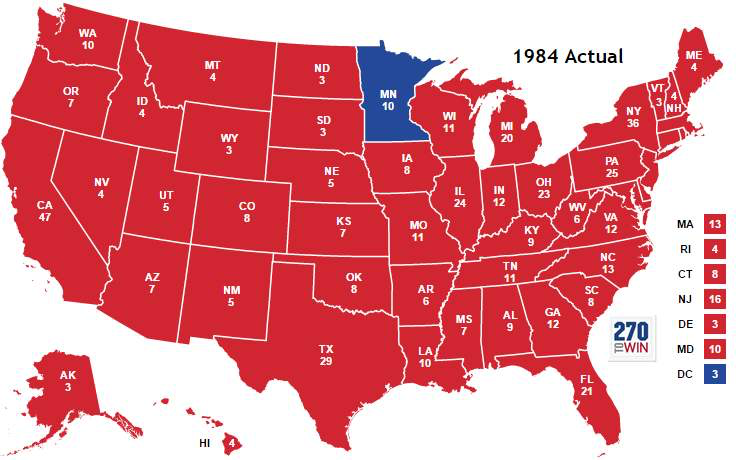 • 1984 年里根在连任大选中赢得 50 个州中的 49 个。