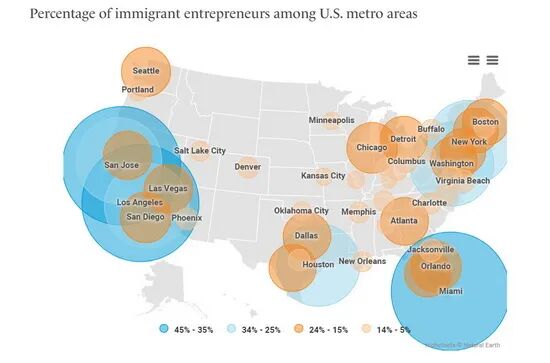 移民在美国企业家中的占比(地区比较)