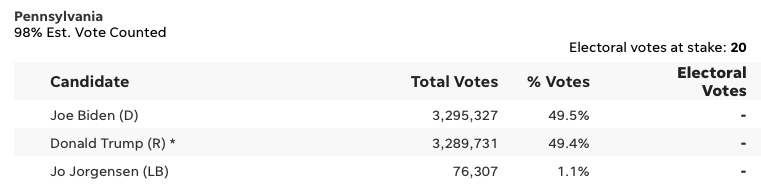 拜登继续逆转势头:随着“最后关头的点票”,拜登在佐治亚州(16票)、宾州(20票)反超川普。手握264票的拜登,只要拿下佐治亚、内华达、宾州三个州中的任何一个,就能轻松跨过 270 票的胜利门槛。