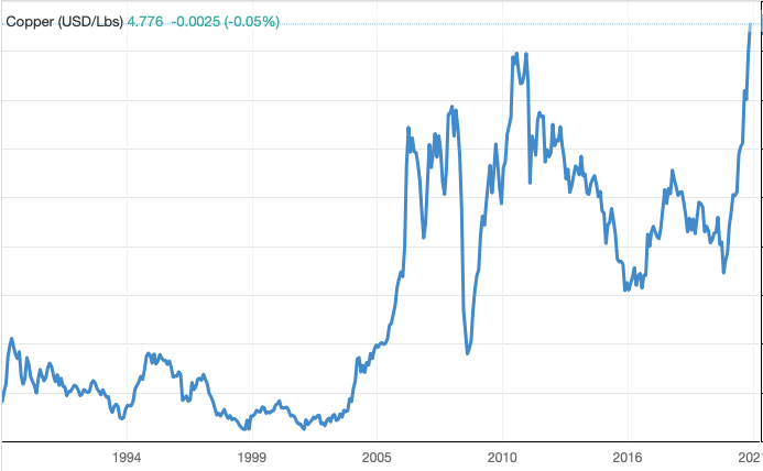 • 大宗商品炒作:最近全球经济仍未摆脱百年一遇的大流行病冲击,而大宗商品价格已经飘到了空中。铜价创造了历史新高,疯狂的流动性正在寻求投机目标。无他,唯钱多耳。