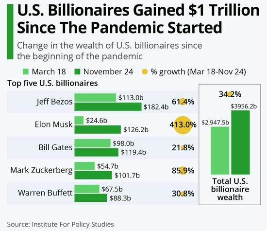 市场机制最大的阴暗面就是不平等,美国1%的人在2002-2007年攫取了国民收入的65%——30年前最富1%只获得12%。美国的中产阶级在次贷危机爆发前的30年里,收入停滞不前。金融危机后的货币刺激加剧了不公平:与2009年相比,2010年美国所创造的额外收入中高达93%为1%富人所得。在2020年年数千万人失业的悲惨世界中,美国最富的650人财富从3万亿猛增到4万亿美元。