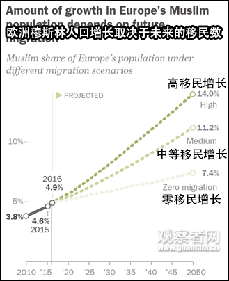• 美国皮尤研究中心2017年报告认为:欧洲的穆斯林人口在未来几十年将大幅增长,部分国家的穆斯林人数甚至会翻三倍。德国的穆斯林人数占比在2016年为6.1%,如果移民增速不减的话,到2050年,穆斯林将占总人口数的19.7%。