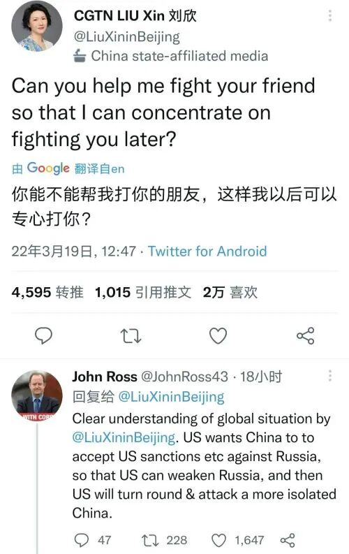 所以,美国现在希望拉中国一起孤立俄罗斯,中国不会上这个当。正如中国环球电视网(CGTN)主播刘欣那句评论所言: