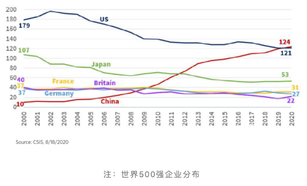 • 2020年《财富》杂志发布了世界500强企业排名,其中中国企业数量(124家)首次超过于美国企业数量(121家)。正如《财富》杂志所说:“美国世纪……终于让位于一个新的现实。"