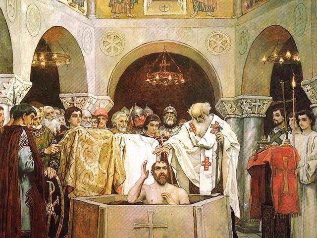 “勇者”斯维亚托斯拉夫的儿子弗拉基米尔(“大帝”)于980年登基。989年弗拉基米尔入侵克里米亚,要求得到拜占庭皇帝的妹妹。拜占庭人满足了联姻要求,而弗拉基米尔则改宗基督教。他的受洗开启了基辅罗斯长达几个世纪的基督教化进程。这一事件堪比君士坦丁大帝承认基督教在罗马帝国的合法地位相提并论。弗拉基米尔将罗斯带入基督教世界,这是一个决定性的时刻,其影响延续至今。1853年,弗拉基米尔的塑像在基辅落成,保存至今。