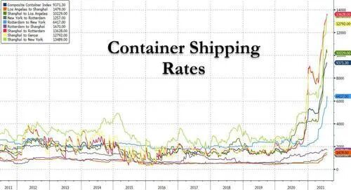 不仅仅是贸易战,新冠大流行更让全球供应链陷入混乱,2021年中美东海岸航线(世界上最繁忙的集装箱航线之一)的每个集装箱现货价格比2020年上涨了500%。此外,美国还忙着通过印太经济框架、美国-东盟峰会、美洲峰会等组合拳推动“全球供应链重构”,无疑是雪上加霜。
