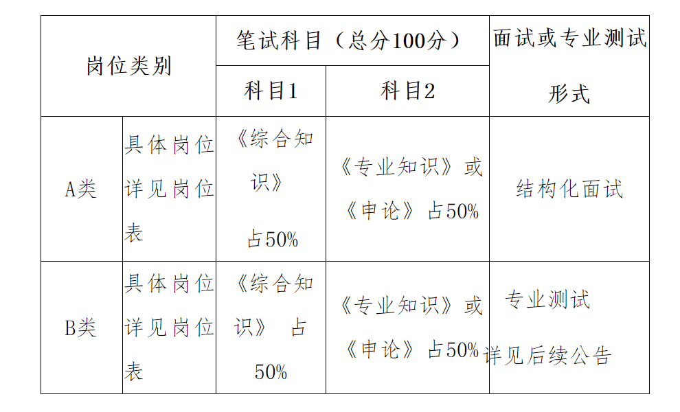 1.笔试工作由市人社部门统一组织,采取闭卷形式进行,考试科目根据岗位类别如下表: