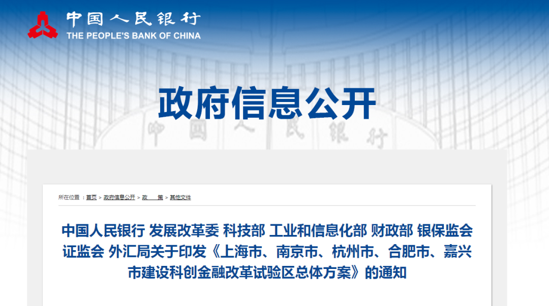 为深入贯彻党中央、国务院决策部署,按照《长江三角洲区域一体化发展规划纲要》和《国家创新驱动发展战略纲要》要求,经国务院同意,2022年11月18日,人民银行、发展改革委、科技部、工业和信息化部、财政部、银保监会、证监会、外汇局印发《上海市、南京市、杭州市、合肥市、嘉兴市建设科创金融改革试验区总体方案》(以下简称《总体方案》)。