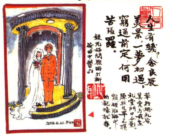 结婚时,俩人曾有过一张结婚照,后来这张照片遗失了,饶平如就按照记忆画了一张。
