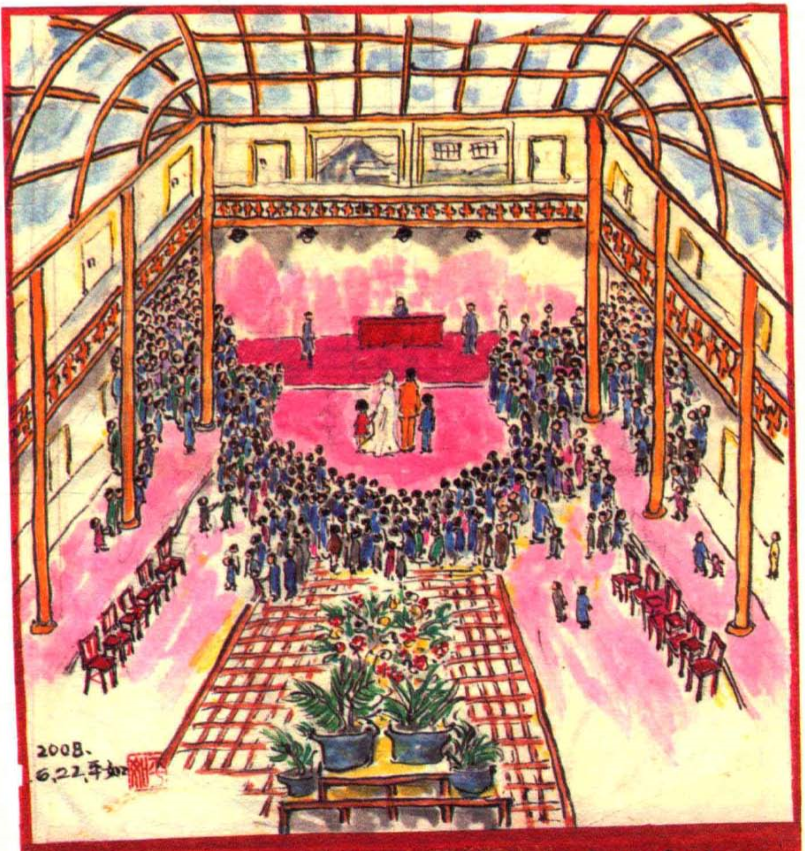 “台上铺着红布,摆着我们的结婚证书和图章,美棠穿着白色的婚纱、红色的鞋子。我穿着淡黄色的军便服。”