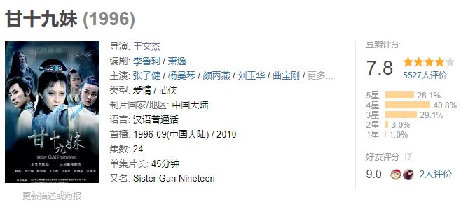 1995年的《白眉大侠》(7.4分),1996年的《甘十九妹》(7.8分),与TVB1995年古天乐李若彤版的《神雕侠侣》和1996年吕颂贤梁艺龄版《笑傲江湖》同时,就当是的影响力来说,至少也是平分秋色。1997年内地版的《燕子李三》,将这股武侠热潮推向新的高度。