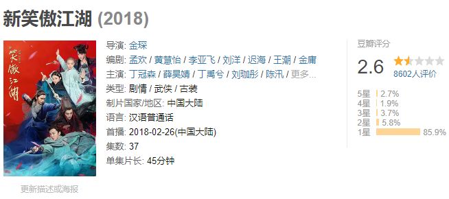这一点,随着2018年,占据武侠剧史倒数第一、二位的2.3分的《新寻秦记》和2.6分的《新笑傲江湖》的同时诞生而更加凸显。