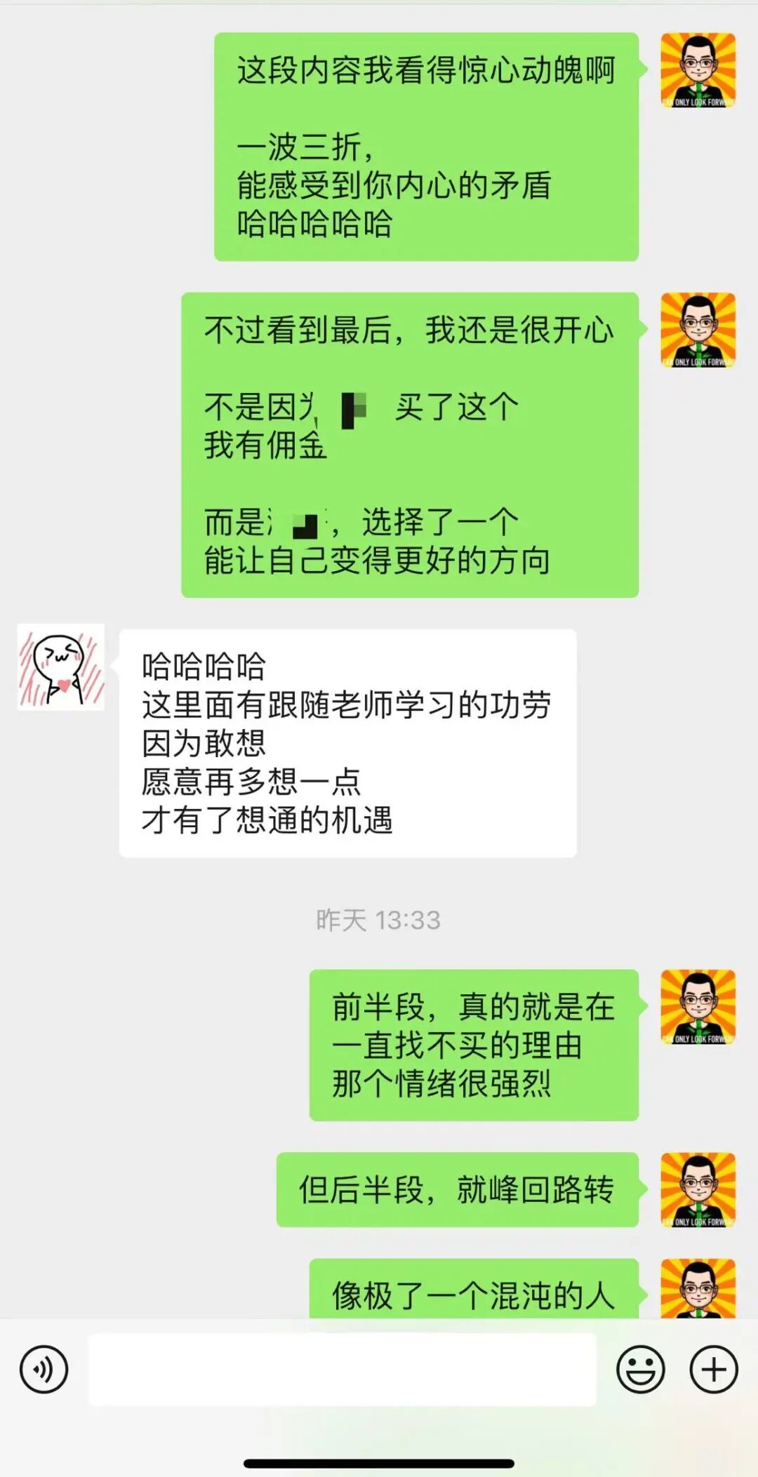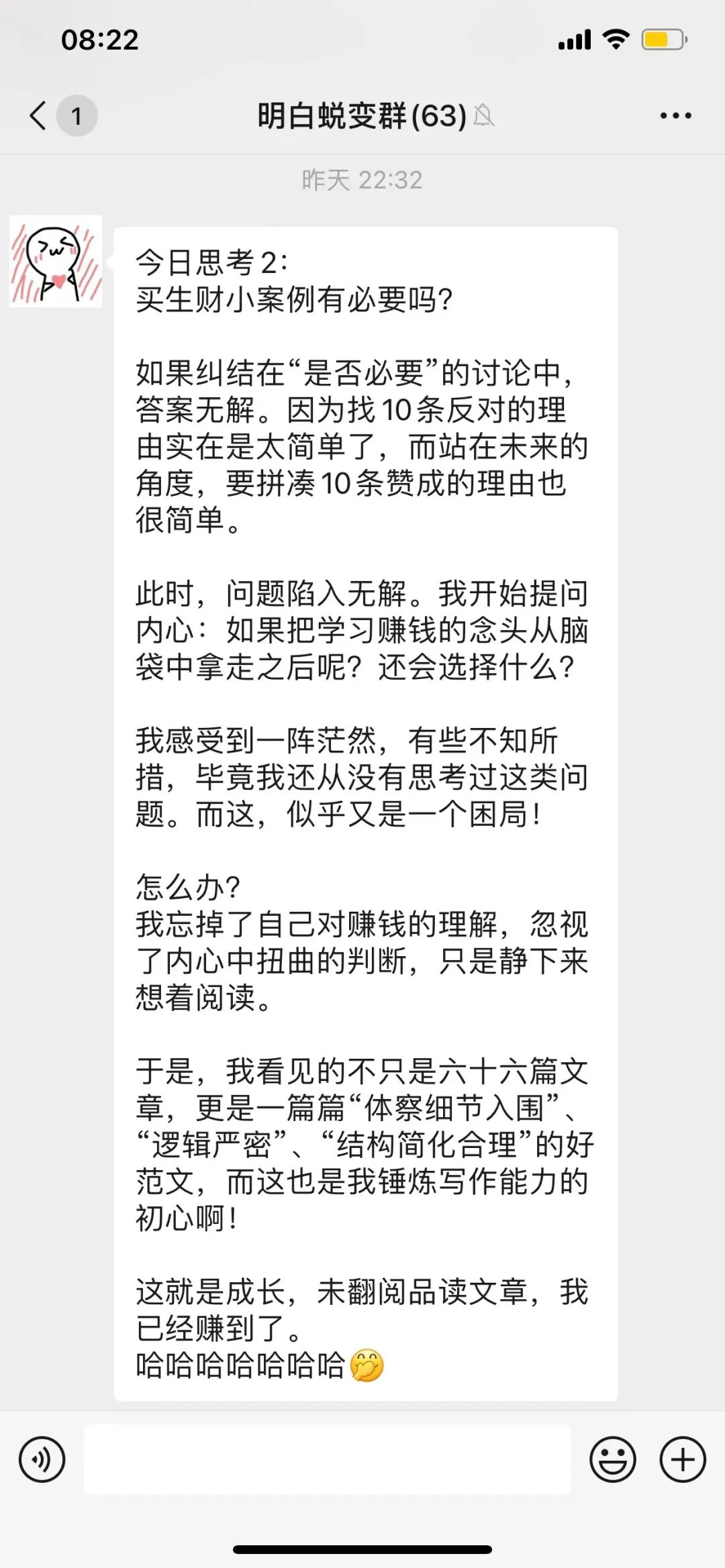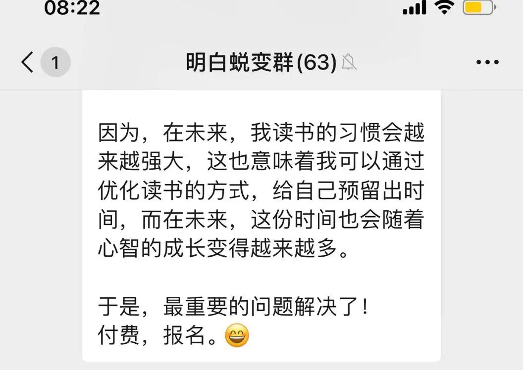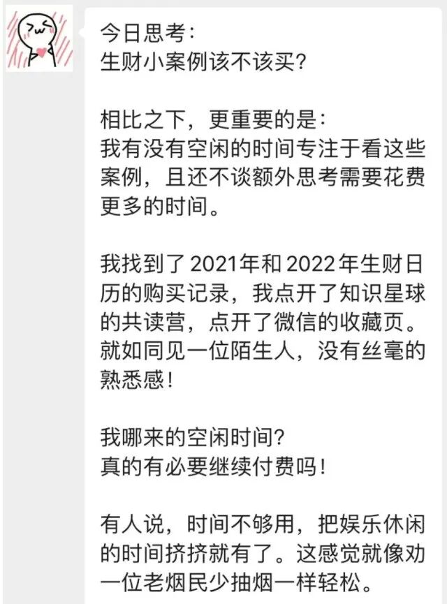 昨天我在一个群里,推荐了生财的一个内容产品《亦仁亲自挑了 66 个赚钱项目,价值 10 万块!》,有一个同学买了之后,发了一段话 ——