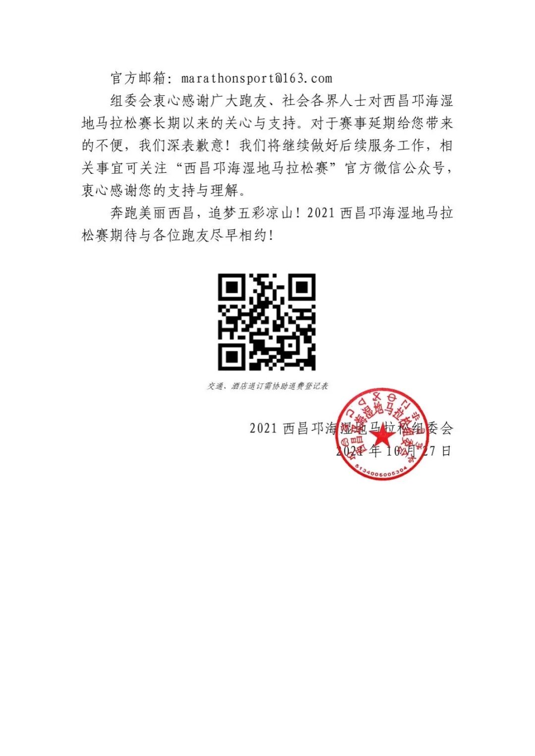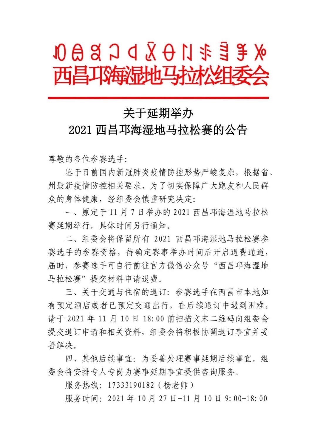 关于延期举办2021西昌邛海湿地马拉松赛的公告