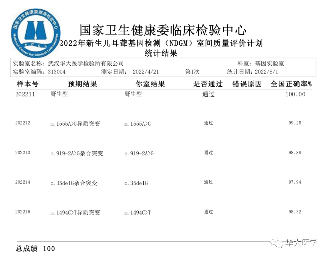 近日,国家卫生健康委临床检验中心公布了《2022 NCCL 新生儿耳聋基因检测室间质量能力验证报告》,华大基因深圳、武汉、天津等9家检验实验室均满分通过。华大基因每年积极参与全国开展的新生儿耳聋基因检测室间质量评价,已经连续七年满分通过评价,充分证明了华大基因的耳聋基因检测的高质量检测水平。《2022 NCCL 新生儿耳聋基因检测室间质量能力验证报告》(节选)