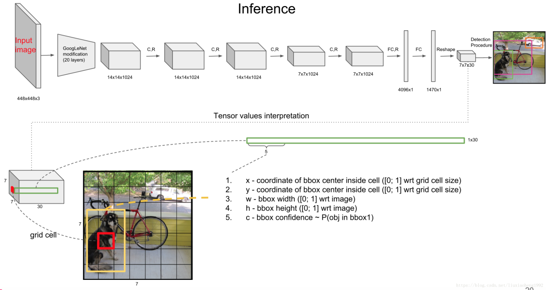来看一下每个单元格预测的B个(x,y,w,h,confidence)的向量和C的条件概率中,每个参数的含义(假设图片宽为高为,将图片分为: