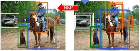 NMS,即非极大值抑制,就是将一些冗余框去掉,示意图如下: