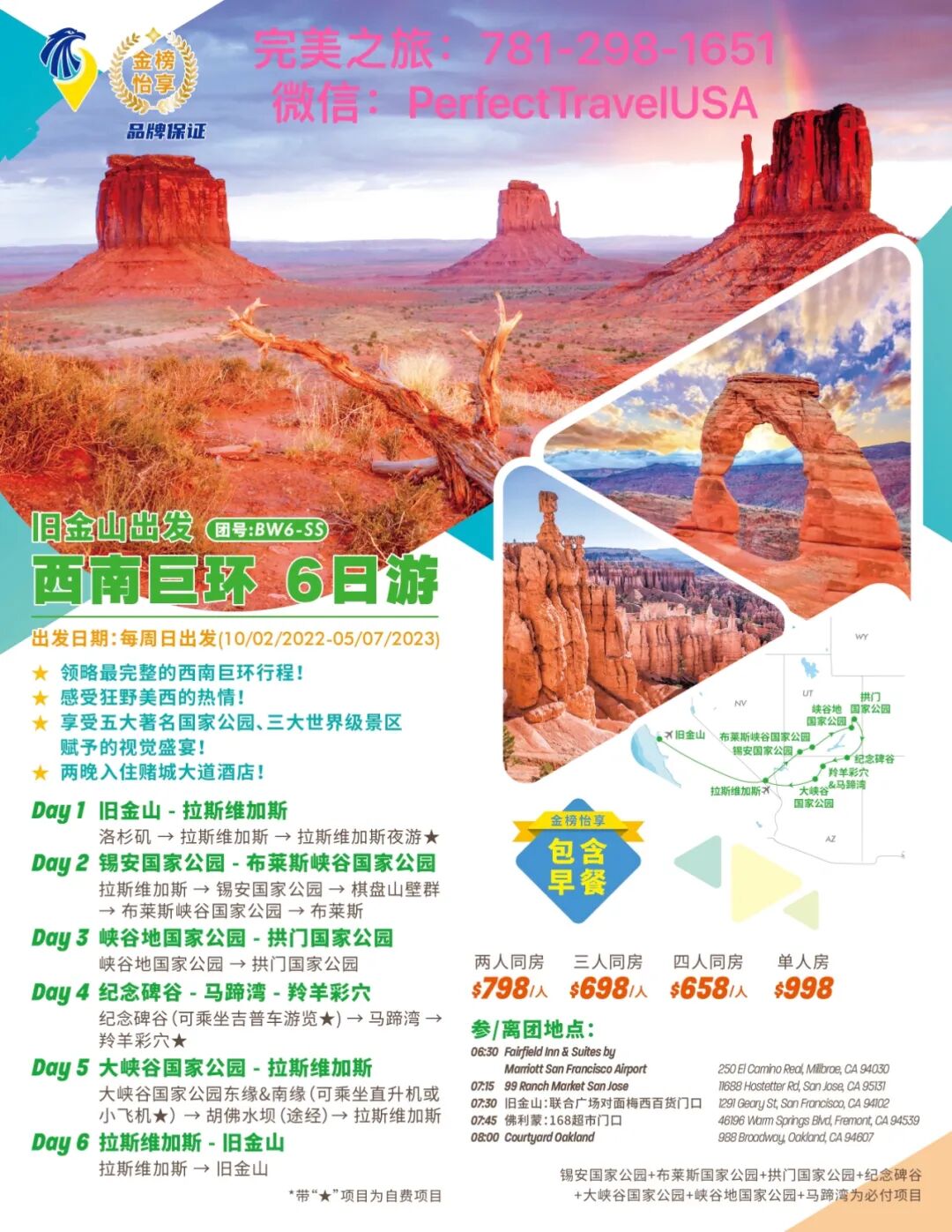 包含:锡安国家公园、布莱斯国家公园、拱门国家公园、纪念碑谷、大峡谷国家公园、峡谷地国家公园、马蹄湾、燃油费