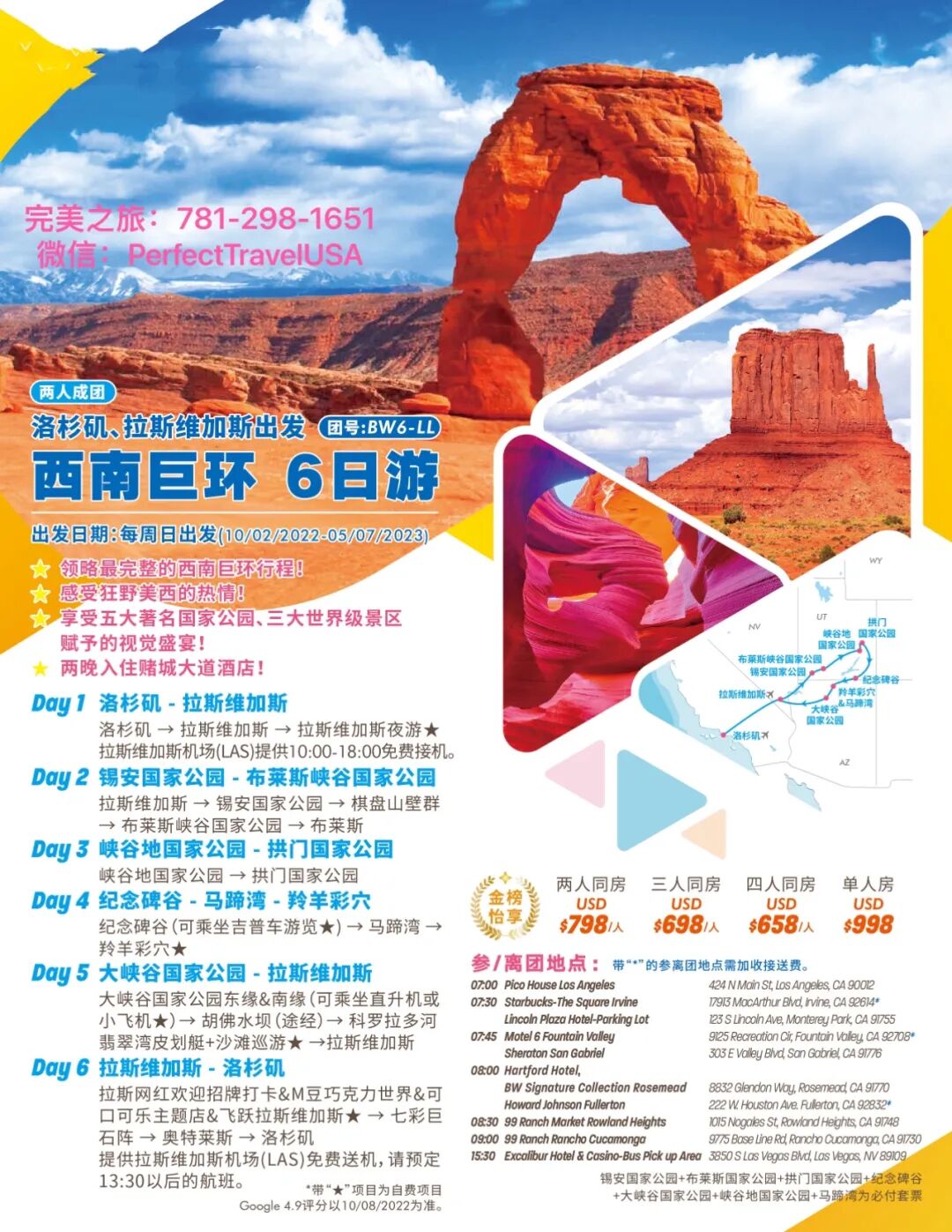 【金榜怡享】西南巨环6日游丨洛杉矶/拉斯出发+锡安公园+布莱斯峡谷国家公园+峡谷地国家公园+拱门国家公园+羚羊彩穴+大峡谷公园 BW6-LL