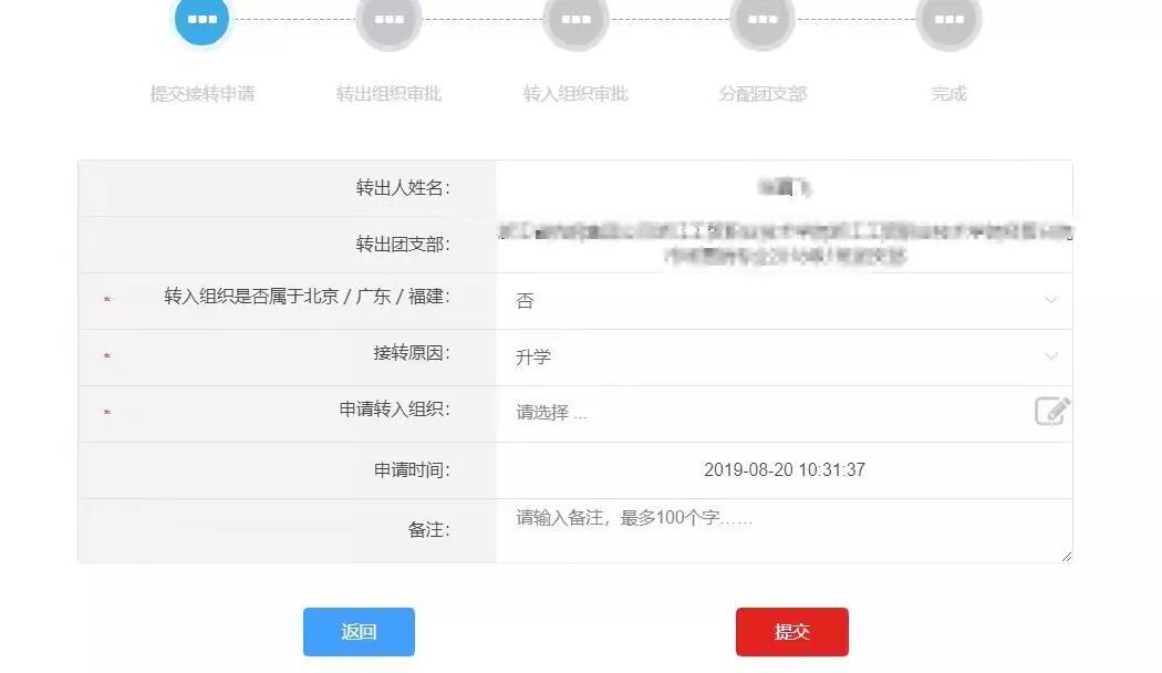 新生团员登录系统,进入个人中心,点击左侧“关系接转”菜单。填写接转原因、转入组织名称等相关信息,检查无误后点击提交,等待审批即可。