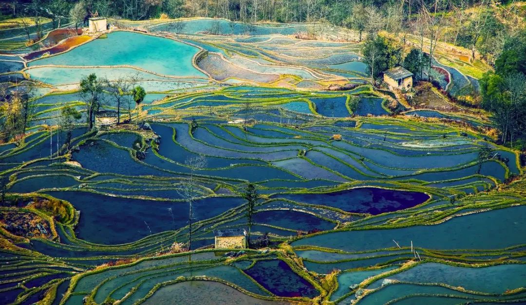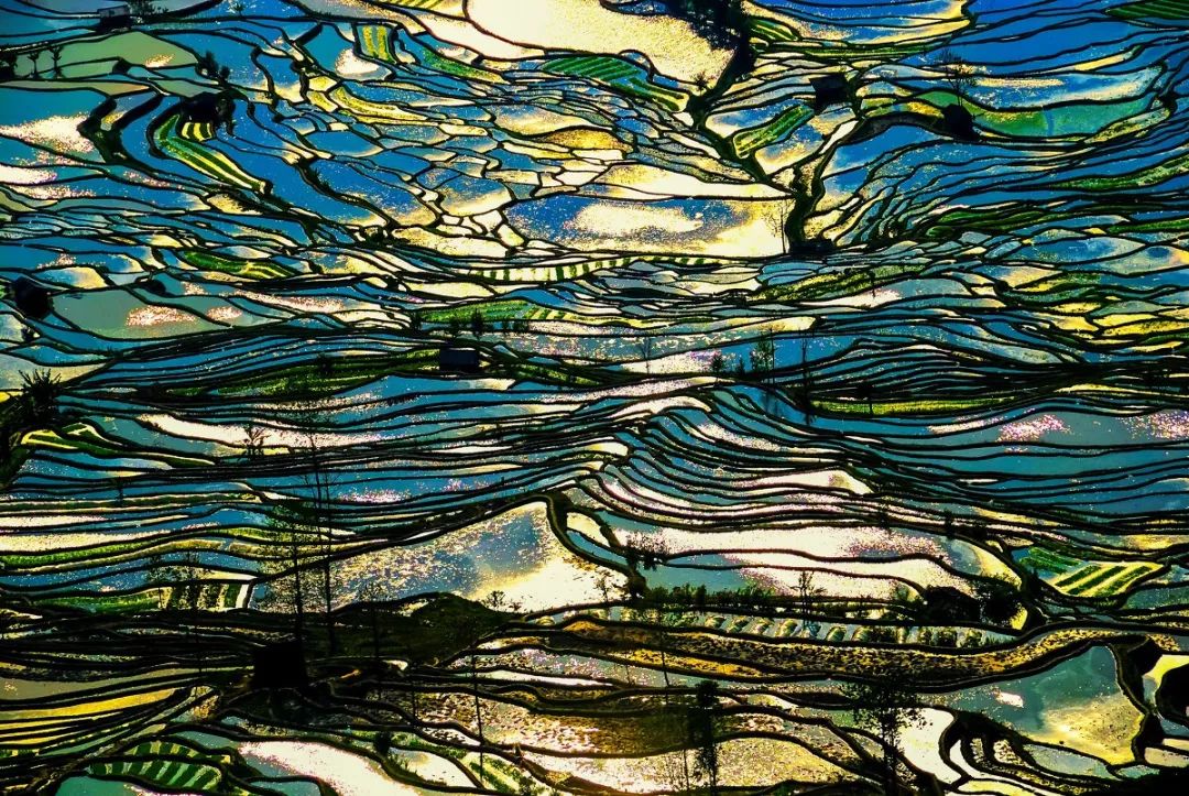 层层叠叠的水面,倒映着白云蓝天,树木山川,像极了一块块精美的彩色玻璃。