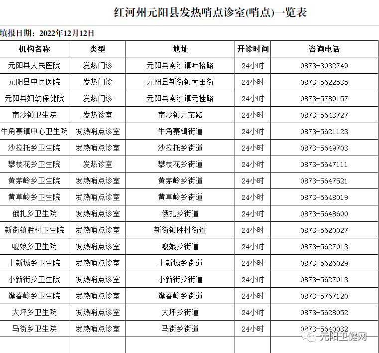 近期,疫情形势严峻,为科学精准防控疫情,优化就诊流程,保障群众就医需求,更好地守护群众生命安全,现将元阳县开设发热门诊 (哨点诊室)的医疗机构名单信息予以公布,请发热患者到就近医疗机构就诊。