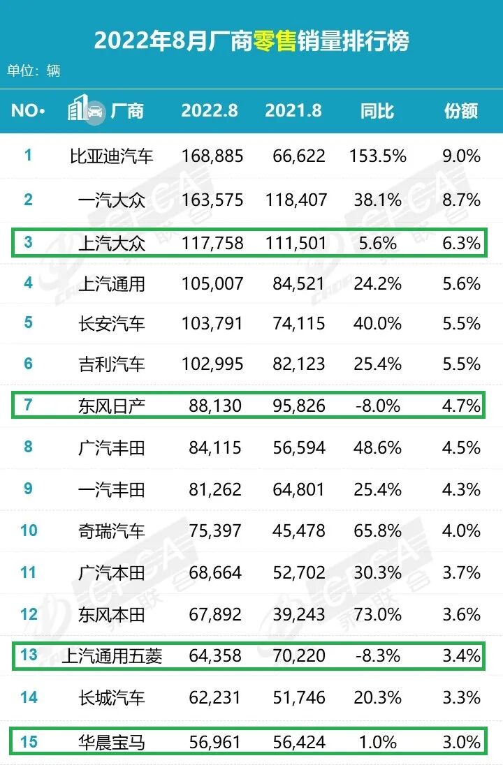 我查看了一下历史数据,东风日产7月批发量低增长,6月负增长……另外同比来说,8月上汽大众的批发增速仅为3.8%,在大厂中这个增速也是垫底系列。长城汽车8月批发量虽然实现了2位数增长,但7万多辆的批发数据,比7月8万多辆其实要少。因此排名上,也由7月的第10,下滑至8月的13。话说6月时也是13位。对了,8月长城的批发量不仅比7月低,也不如6月。当然这个也可以理解,其他一些车企也有这个情况,毕竟8月是今年最热的月份,不少车企或多或少都有影响。其他车企的绝对批发数字、位次变动,杠杆游戏就不多说。最大的黑马,要数奇瑞汽车。7月该司批发量实现了超120%的同比增长,且比7月的超12万辆继续增长,达到13万辆多。大厂中,也只有奇瑞汽车和比亚迪汽车实现了100%以上的增速。对了,8月比亚迪汽车夺回了批发量第一。5月一汽大众拿回属于自己的铁王座后,比亚迪虽然很猛,但此后连续几个月没有再次超越,终于再次登顶。提前预告一句,8月零售量第一也是比亚迪汽车,终于再次斩获双冠王。2、东风日产、长城汽车、上汽通用、长安汽车、一汽大众、东风本田,前8月批发量负增长。一汽丰田暂时摆脱负增长。长城汽车、东风日产前7月时,批发量都是下滑超10%。前8月,这2家在大厂中,依旧位居批发量同比下滑前列。“困难户”上汽通用也是继续同比处于下滑中,还不错的是,下滑幅度和前7月比也有收窄。前7月批发量本就微弱增长的长安汽车,在8月高温限电背景下,当然是扛不住了。然后,一汽大众、东风本田前8月的批发量也都继续同比下滑,当然幅度都有收窄,还是不容易。同时,一汽丰田前8月批发量终于回正,艰难摆脱了前7月的负增长。3、东风日产、上汽通用五菱8月零售量负增长,上汽大众、华晨宝马个位数增长。长城汽车在大厂中销量增长其实偏低,环比也是下滑的。上汽通用7月零售量负增长,上汽通用五菱增长忽略不计。到了8月,上汽通用五菱直接零售量同比负增长了。7月同比个位数增长的东风日产,8月零售量也陷入负增长。上汽大众、华晨宝马8月零售量,同比个位数增长,7月时,上述2家公司也有这个情况。还值得一说的是,杠杆游戏发现长城汽车虽然8月零售量实现了超20%的增长,但是在前15位的大厂中,这个增速其实不算高。当然环比下滑的不止长城汽车一家,只是长城汽车2022年的表现总体不够好,特别是在自主大厂中显得相对差一点,且杠杆游戏一直喜欢这家公司,所以我多说几句。对了,要再次恭喜一句,比亚迪汽车拿下了8月零售量冠军,实现批发、零售双冠王。4、前8月零售量,15家大厂只有比亚迪汽车、长安汽车、广汽丰田、广汽本田、奇瑞汽车5家正增长。广汽本田、长安汽车前7月时也是负增长的。上汽通用前8月零售量下滑幅度最大,同比下滑了24.7%。另外下滑比例达2位数的,还有上汽大众、东风日产、长城汽车、上汽通用五菱。值得一说,广汽本田、长安汽车前8月零售量也只录得微弱的正增长,杠杆游戏注意到前7月时,这2家都是负增长的。当然如下图,我们可以发现,尽管很多车企前8月零售量依旧负增长,但是降幅有所收窄。值得一说,前8月销量,自主品牌奇瑞汽车在大厂中,仅次于比亚迪的增速。前5的公司中,比亚迪第2、长安汽车第3、吉利汽车第5,自主品牌占据3席(和前7月一致),不容易。长城汽车也还在前10,第10位,不过要加油,不小心就要退出前10了。5、8月新能源销量,赛力斯汽车增速超1100%,吉利汽车也超380%,长城汽车负增长,上汽通用五菱、长安汽车、蔚来汽车、小鹏汽车增速低于100%;前8月新能源产品销量增速,长城汽车、上汽通用五菱、蔚来汽车真是不高,特斯拉中国、理想汽车、一汽大众、小鹏汽车也都低于100%。前8月新能源汽车销量前15大厂中,有11家自主品牌公司。赛力斯汽车的主力产品问界系列,是原小康股份(现赛力斯集团)和华为合作的,这个超级增速,当然离不开华为的加持,同时也不否认赛力斯集团押注的决心。其他增速超过100%的杠杆就不说,杠杆游戏主要想说,哪些低于100%增速的。特别长城汽车的新能源8月甚至小幅负增长,你说气人不气人。此外,如上图,上汽通用五菱、长安汽车、蔚来汽车、小鹏汽车的新能源产品8月销量增速,也都低于100%。上汽通用五菱还可以说基数很高了,蔚来汽车、小鹏汽车这些,真的有点让人忧心了。至于说理想汽车,前15已经看不到人,希望早日回归榜单。前8月新能源产品销量增速,长城汽车、上汽通用五菱、蔚来汽车真是不高。特别长城汽车、上汽通用五菱的增速不到20%。此外,特斯拉中国、理想汽车、一汽大众、小鹏汽车也都低于100%,如下图。对了,杠杆游戏必须说一句,前8月新能源汽车销量前15大厂中,有11家自主品牌公司。如上图,它们分别是比亚迪汽车、吉利汽车、奇瑞汽车、广汽埃安、长安汽车、哪吒汽车、小鹏汽车、长城汽车、零跑汽车、理想汽车、蔚来汽车。前10大厂中,只有上汽通用五菱、特斯拉中国是合资或外资。本文所有数据引用自乘联会,且为初步统计数据,部分和车企发布数据略有出入,再次说明并致谢,并请包涵