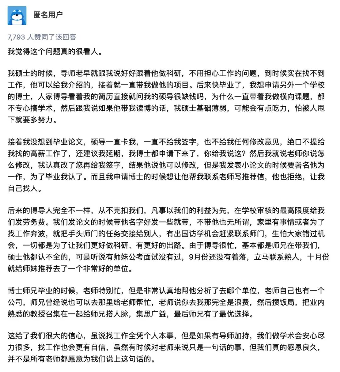 自己的神仙导师用学校审核的最高限度给博士生们发劳务费,不要求博士们发论文带自己的名字,有出国放学的机会就赶紧联系;有师妹公考面试没有过,就直接联系熟人,十月份给师妹推荐去了非常好的单位,师兄毕业的时候,不仅帮忙分析去那个单位,还撺饭局把业内熟悉的教授召集在一起给师兄搭人脉……