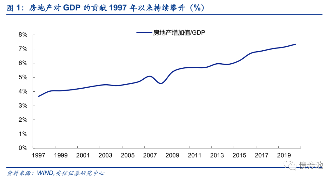 在经过较长时期内把房地产作为刺激经济的手段后,房地产曾出现较为明显的金融化泡沫化势头,“房地产是现阶段我国金融风险方面最大的‘灰犀牛’”,房地产去库存去杠杆势在必行而且迫在眉睫。自2003年确立房地产的支柱产业地位以来,房地产在较长时期内扮演着刺激经济手段的角色,不仅房地产对GDP的贡献率从1997年的1.5%左右快速攀升至2007年的8%附近,2009-2012年还继续维持在5%左右的高位,而且随之而来的是居民杠杆率从1997年的不足10%快速飙升至2013年的30%,而后虽然增速有所放缓但2020年仍超过了60%,同时商业性房地产贷款余额占全部贷款余额的比例在2004-2019年的15年间翻了一番,2020年才开始从近30%的高位缓慢回落,2017年全部房地产相关贷款余额已超过金融机构各项贷款余额的1/3,超过了2008年次贷危机前夕美国房地产抵押贷款与当年GDP之比,为此郭树清书记反复提及“房地产是现阶段我国金融风险方面最大的‘灰犀牛’”。房地产去库存去杠杆已势在必行而且迫在眉睫。