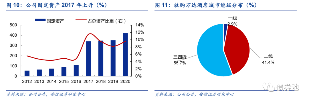 收购完成后,酒店在公司业务中的占比上升。公司固定资产余额由2016年末的109.3亿升至2017年末的342.3亿,占总资产的11.5%。2018年,公司酒店业务收入70.3亿元,相比2017年增加196.0%,2019-2020年,公司酒店业务收入为70.2亿元、44.6亿元。