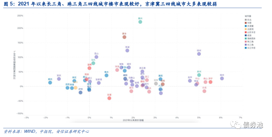 ■三四线楼市表现如何?2021年以来,三四线楼市整体涨幅放缓、区域分化。价格方面,截至2021年8月,三线城市住宅价格指数同增2.8%,较上月下降0.5%;环增0.2%,持平上月。70个样本城市中11城房价下跌,集中于河北、湖南等地;54城上涨,集中于长三角、珠三角地区。销售面积方面,8月83个样本城市销售面积累计同比为20.8%,较7月下滑9.6%。其中24城销售面积累计同比下降,东营、许昌降幅超20%;59城销售面积同比增长,赣州、太仓等地涨幅超1倍。量价结合,岳阳、柳州、常德、泸州量价齐跌,廊坊、安庆等5城价跌量增,绍兴、九江等7城价涨量降。整体来看,2021年以来长三角、珠三角三四线城市楼市表现较好,京津冀三四线城市大多表现较弱,其余省市的三四线楼市表现不一。